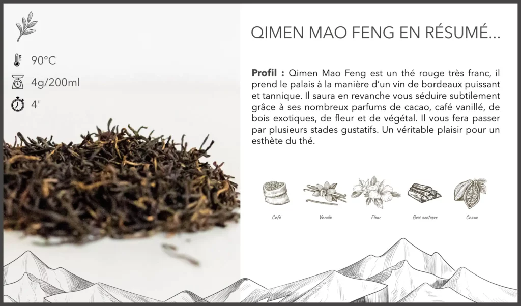Thé noir Keemun ou Qimen ! Quel thé ! Il fait partie de ces thés qui vous marquent, tant il est particulier et puissant. Il s’agit d’un thé noir de Chine, produit dans la province de Anhui, de très bonne réputation et que vous pouvez retrouver en plusieurs grades. Celui dégusté pour l’article d’aujourd’hui est du meilleur d’entre eux puisqu’il s’agit du grade “compétition” et fut récolté au printemps 2023. L’appellation exacte de ce thé noir de Chine est Qimen Mao Feng. Sans plus attendre, je vous propose de vous plonger dans ce nouvel itinéraire (dé)gustatif.